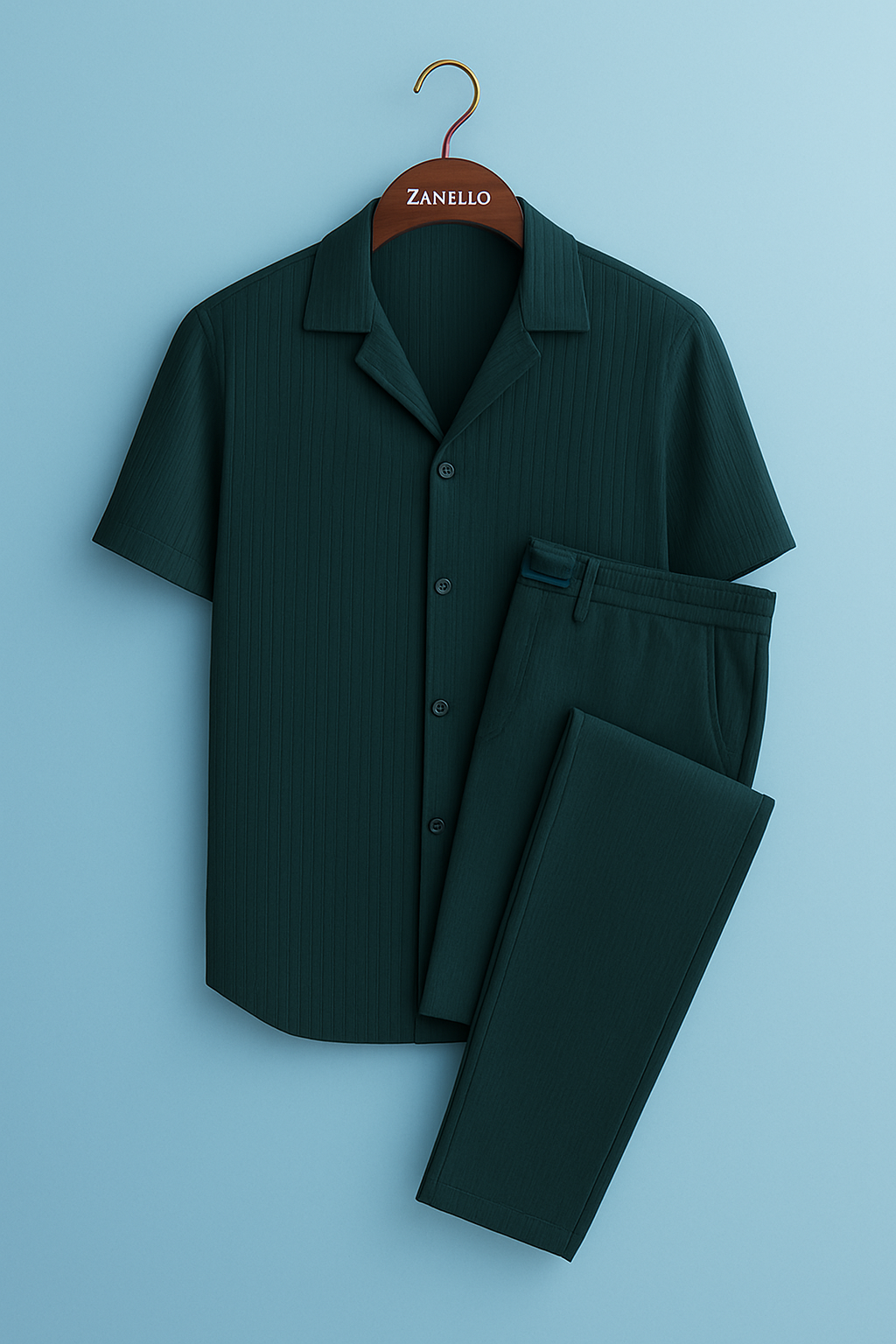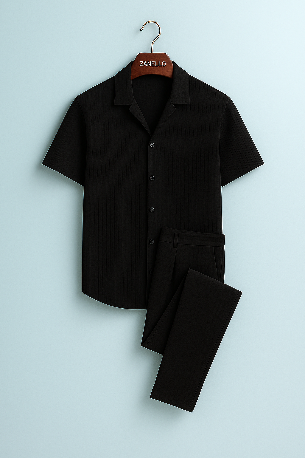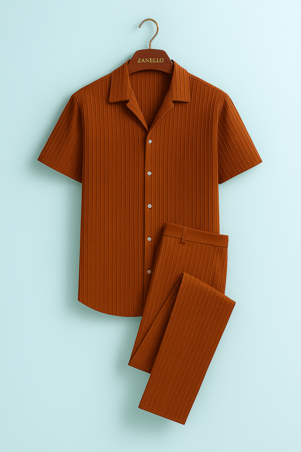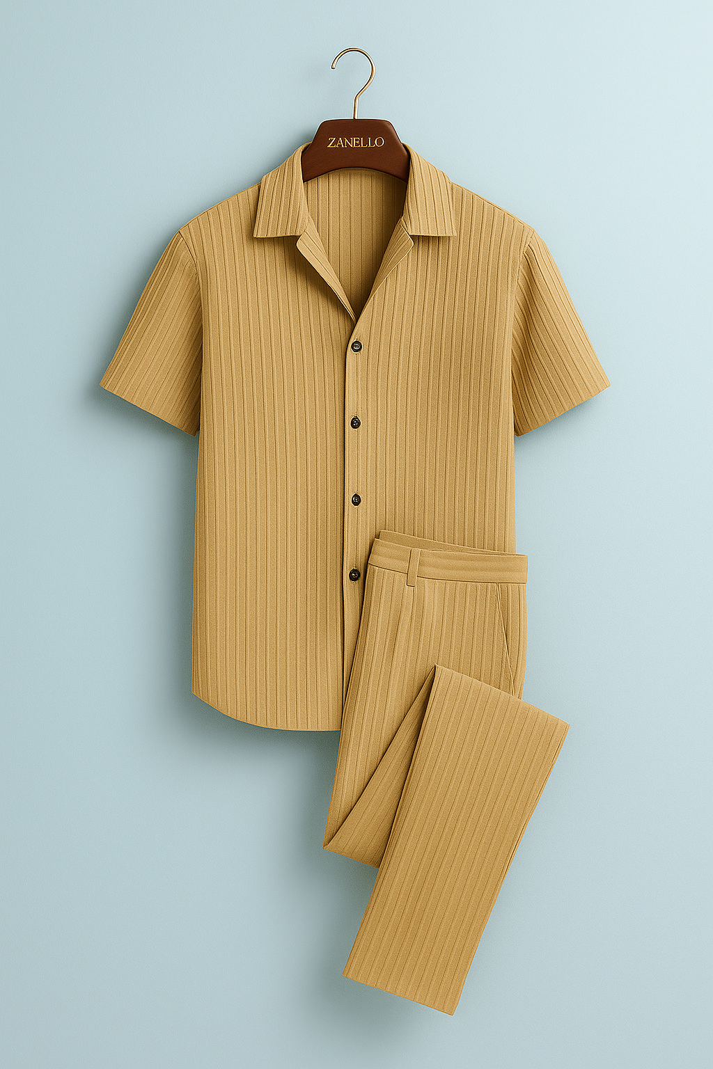 Caratterizzato da un delicato motivo a onde , questo completo da due pezzi comprende una camicia a maniche corte con bottoni e pantaloni lunghi abbinati , rendendolo perfetto sia per i pomeriggi rilassati che per i momenti al tramonto.